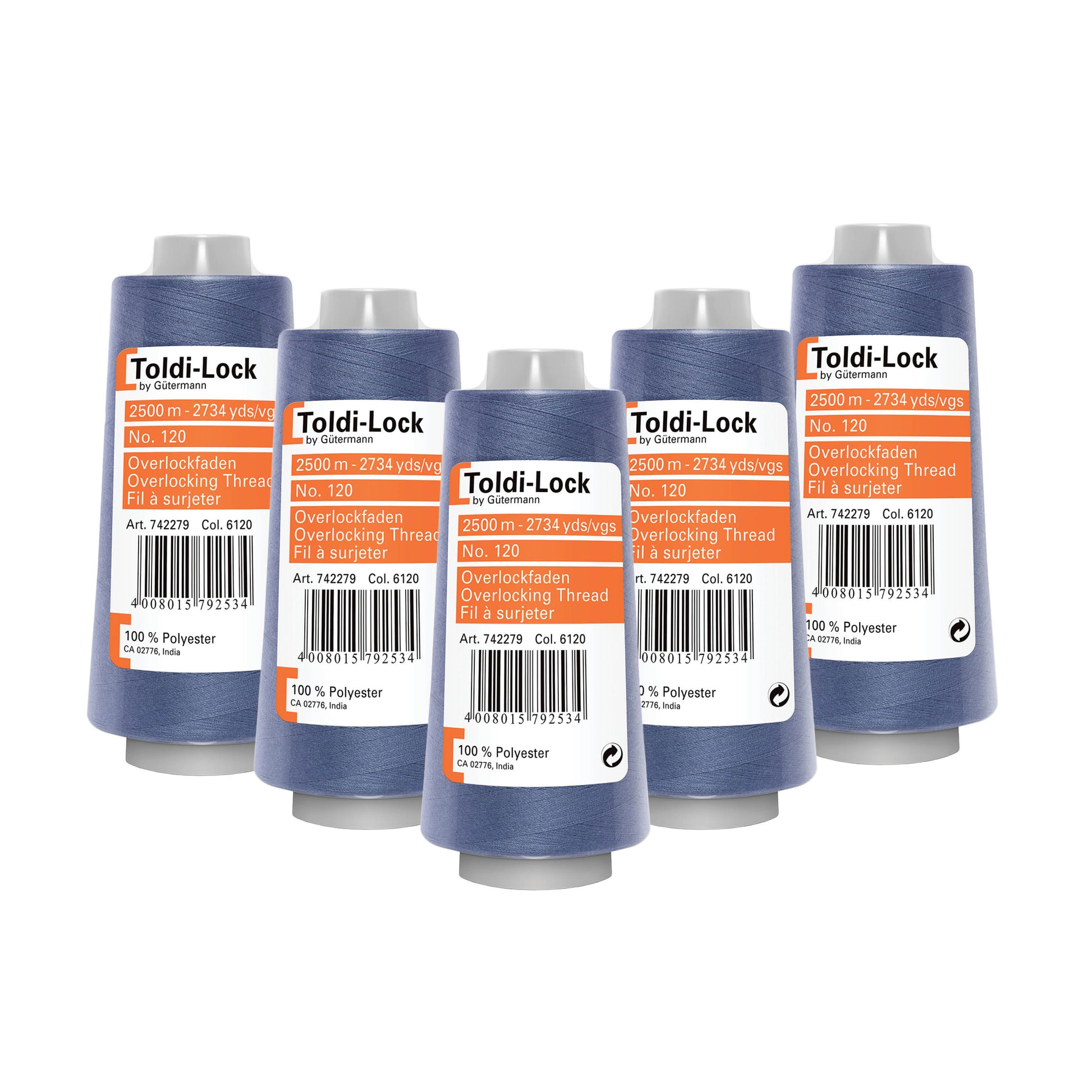 Gütermann Toldi-lock overlocktråd – 5 ruller á 2.500 meter i blå. 100 % polyestertråd i slidstærk og alsidig kvalitet, velegnet til overlock, sømme og kanter i tøj og hobbyprojekter. Perfekt til både syning og kreative opgaver.