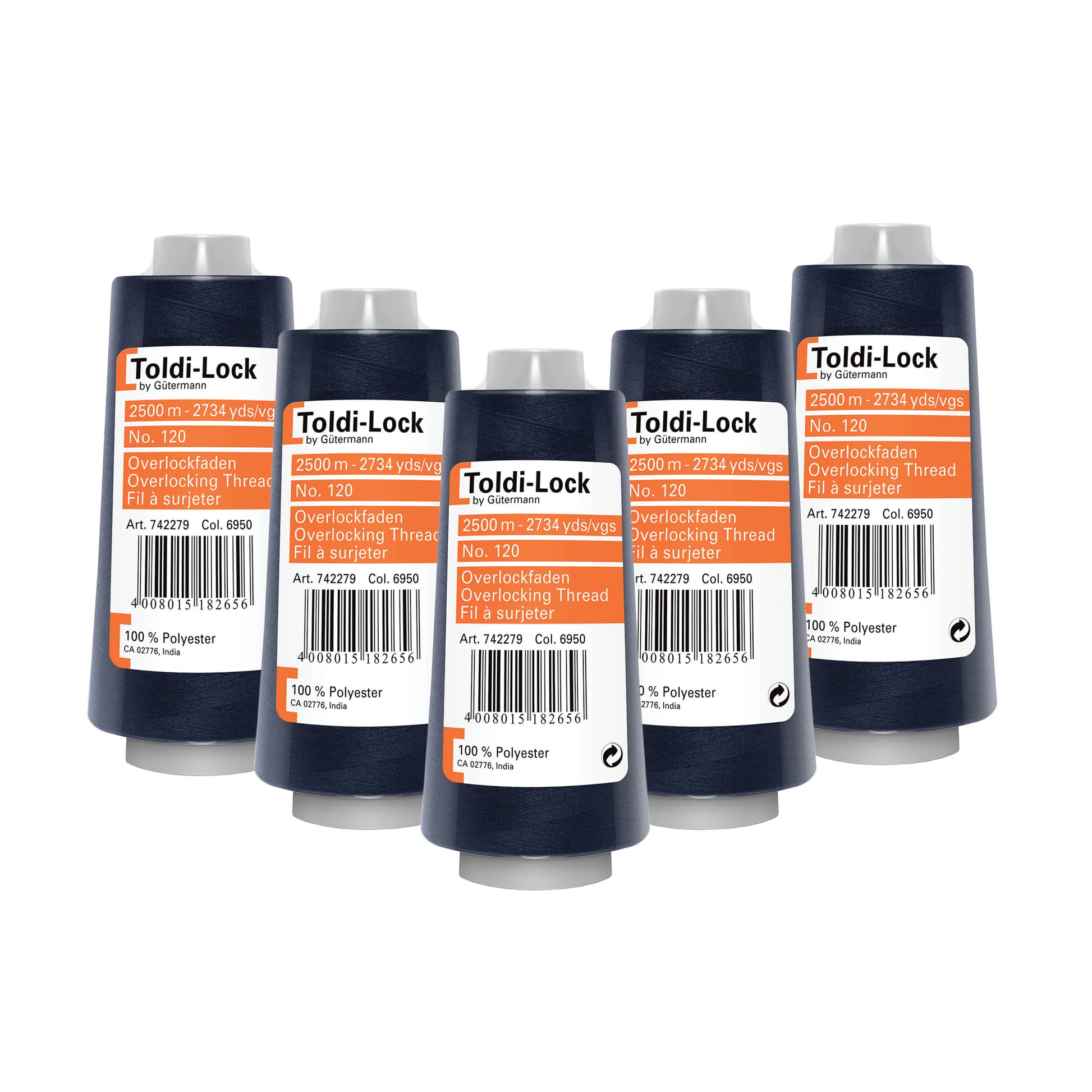 Gütermann Toldi-lock overlocktråd – 5 ruller á 2.500 meter i marine. 100 % polyestertråd i slidstærk og alsidig kvalitet, velegnet til overlock, sømme og kanter i tøj og hobbyprojekter. Perfekt til både syning og kreative opgaver.