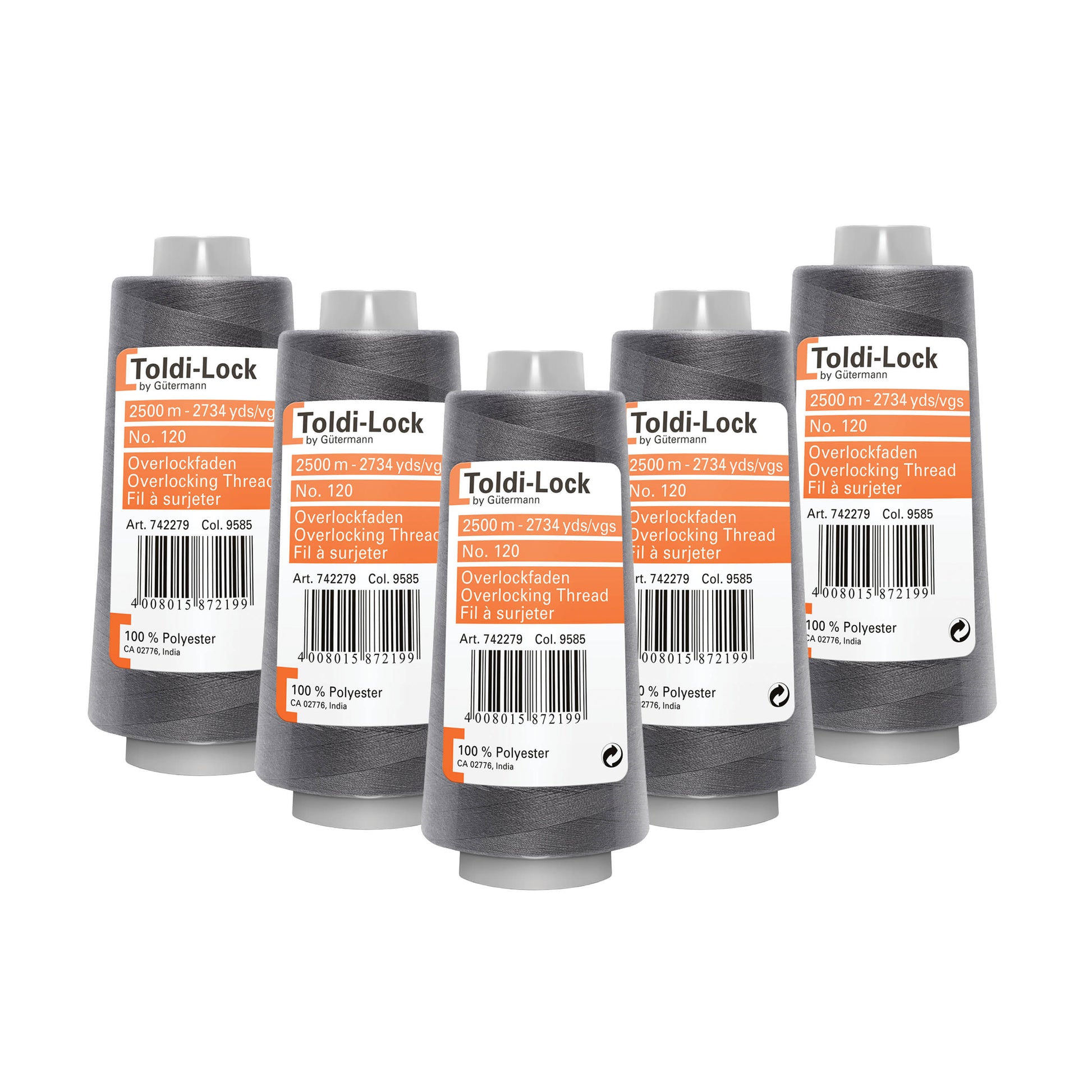Gütermann Toldi-lock overlocktråd – 5 ruller á 2.500 meter i mørkgrå. 100 % polyestertråd i slidstærk og alsidig kvalitet, velegnet til overlock, sømme og kanter i tøj og hobbyprojekter. Perfekt til både syning og kreative opgaver.