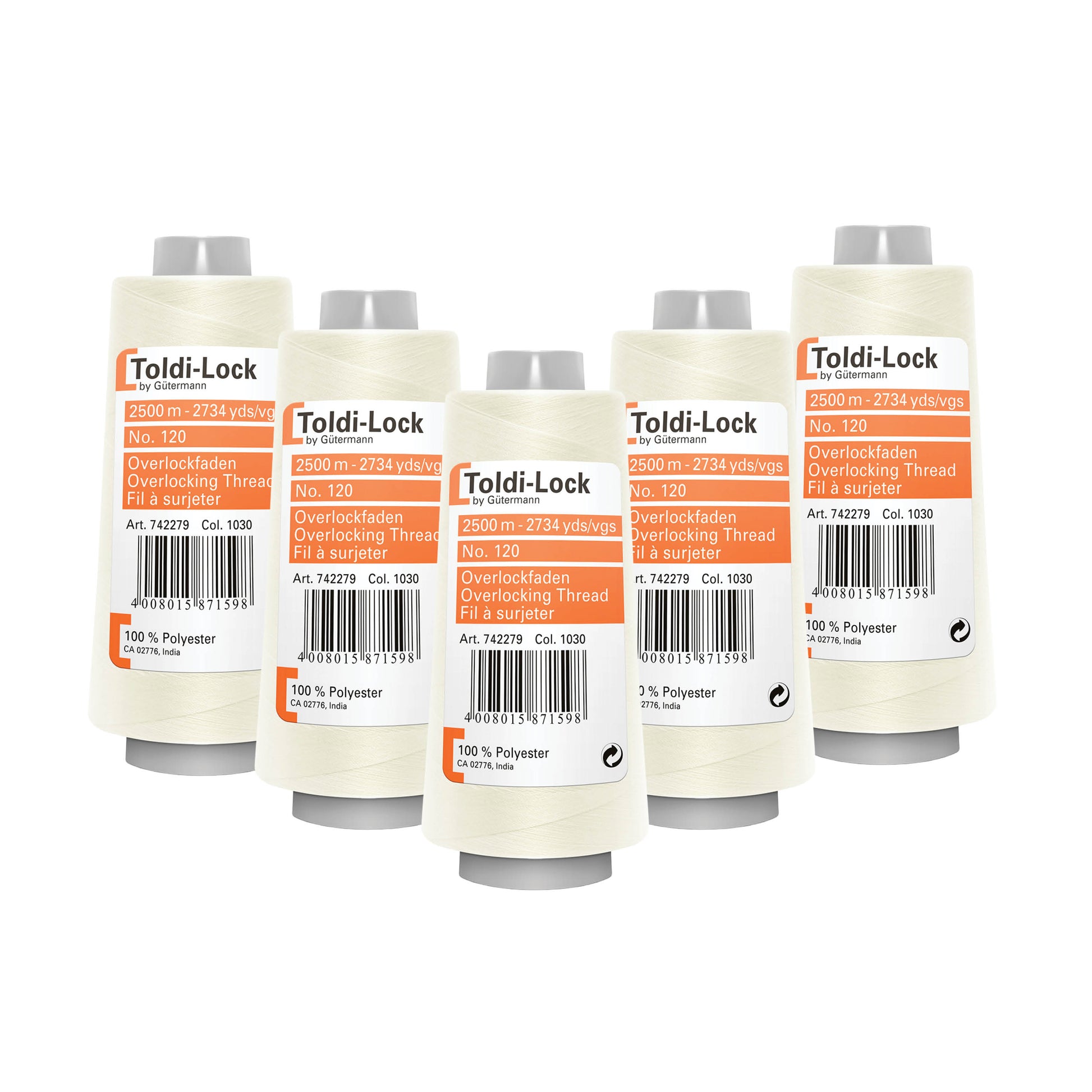 Gütermann Toldi-lock overlocktråd – 5 ruller á 2.500 meter i silk. 100 % polyestertråd i slidstærk og alsidig kvalitet, velegnet til overlock, sømme og kanter i tøj og hobbyprojekter. Perfekt til både syning og kreative opgaver.