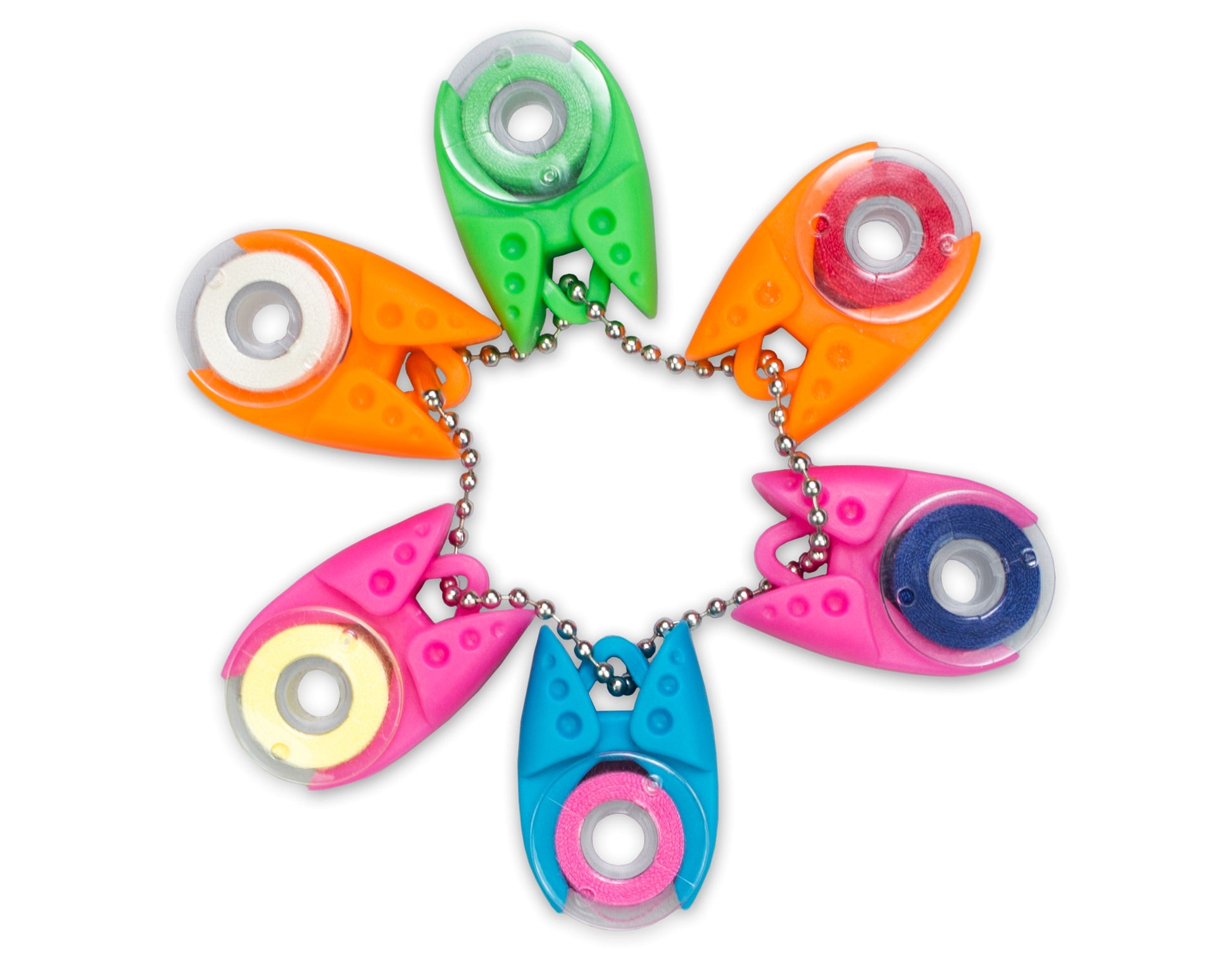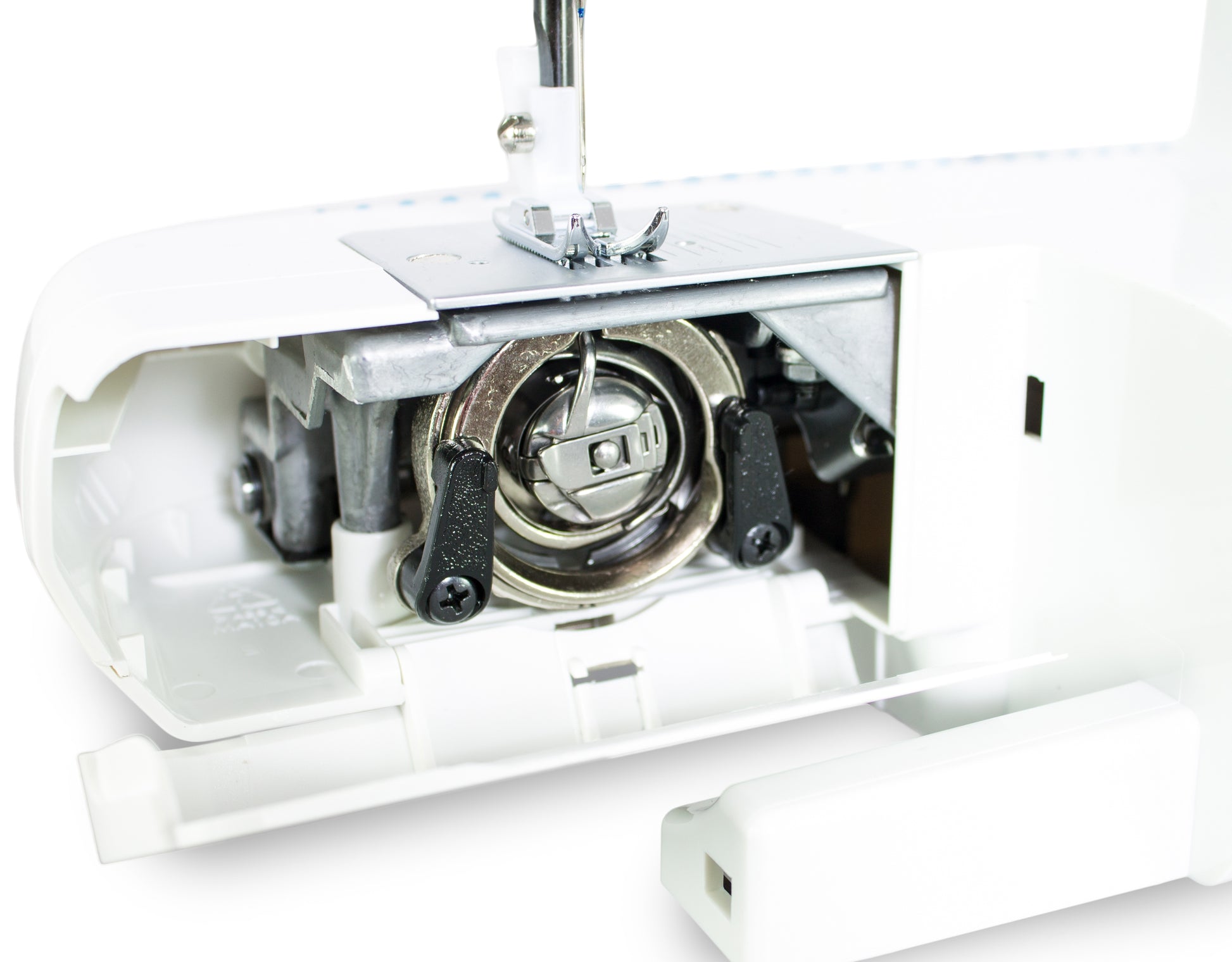 Maskinen er brugervenlig og enkel at anvende, og kommer med et 64-delt trådsæt, spoleclips samt klistermærker.